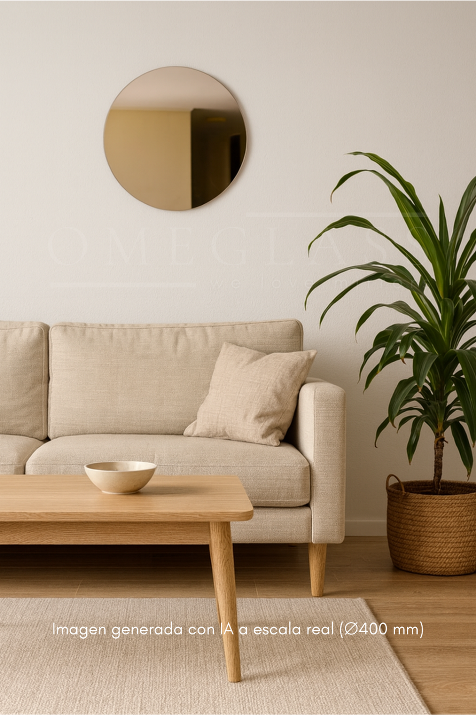 Espejo Bronce Pilkington de 4 mm de espesor con diámetro de 400 mm. Incluye soportes de aluminio 13x50 mm para una instalación firme y sencilla.