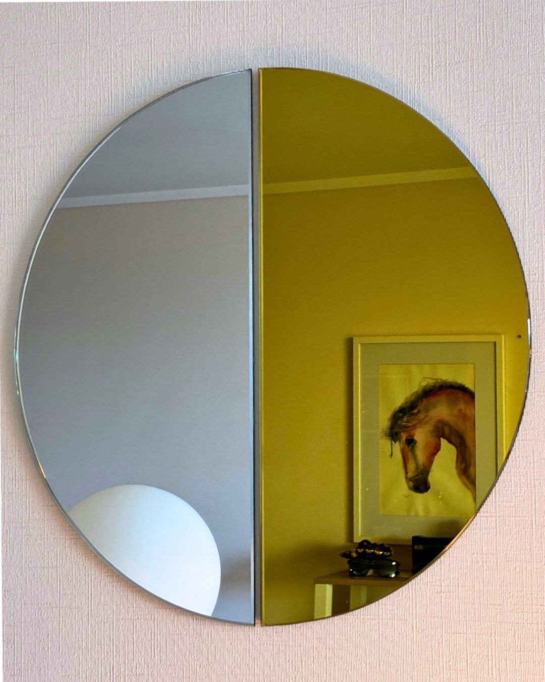 Espejo Oro de 4 mm y Espejo Incoloro de 4 mm de espesor, unidos en un círculo de 50 cm de diámetro. Incluye soportes de aluminio 13x50 mm para una instalación firme y sencilla.
