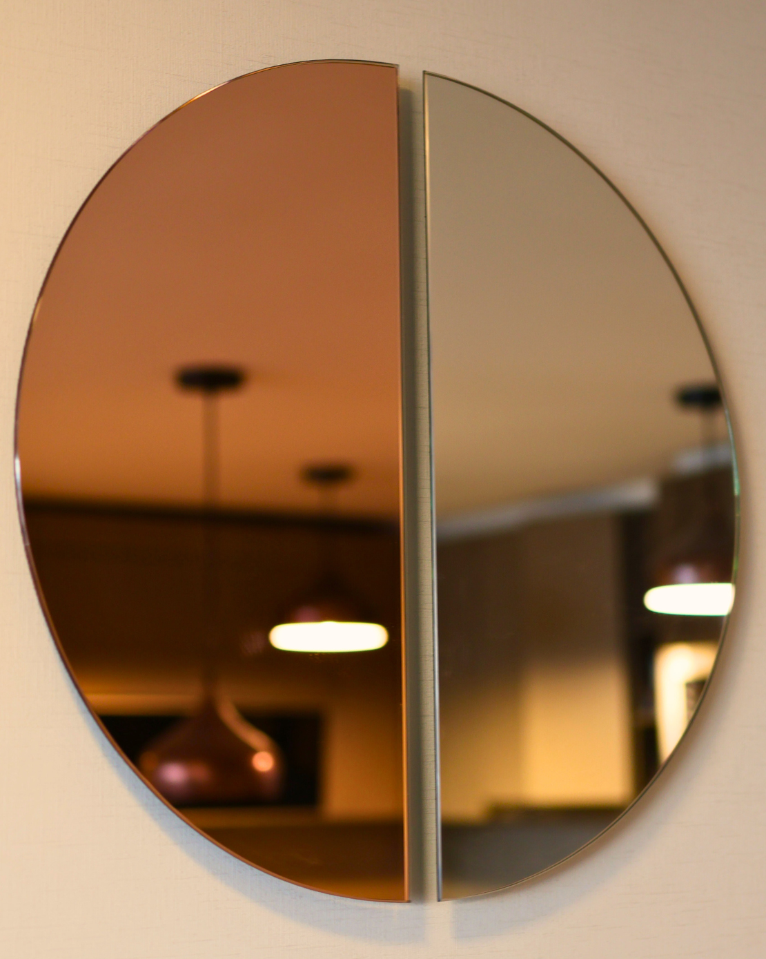 Espejo Rose Gold de 5 mm y Espejo Incoloro de 4 mm de espesor, unidos en un círculo de 50 cm de diámetro. Incluye soportes de aluminio 13x50 mm para una instalación firme y sencilla.